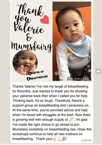 "Thanks Valerie! I've met my target of breastfeeding for 6months. Just wanted to thank you for showing your patience back then when I called you for help. Thinking back, it's so tough. Thankfully, there's a support group on breastfeeding and I persevere on. At the same time, you've provided advice and help when I'm faced with struggles at the start. Now Aden is growing well with enough supply of 🍼. I'm glad I've made the right choice to go ahead to join Mumsfairy workshop on breastfeeding tips. Hope this workshop continue to help all new mothers on breastfeeding. Thank you!✌🏻💪🏻🎉" ~Denise Low