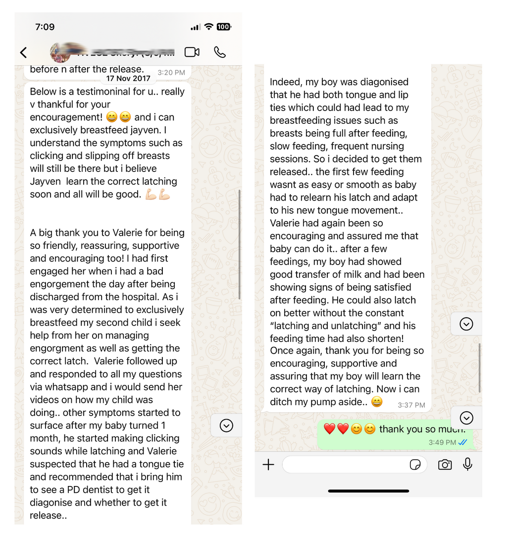 “A big thank you to Valerie for being so friendly, reassuring, supportive and encouraging too! I had first engaged her when I had a bad engorgement the day after being discharged from the hospital. As I was very determined to exclusively breastfeed my second child i seek help from her on managing engorgement as well as getting the correct latch. Valerie followed up and responded to all my questions via whatsapp and i would send her videos on how my child was doing.. other symptoms started to surface after my baby turned 1 month, he started making clicking sounds while latching and Valerie suspected that he had a tongue tie and recommended that i bring him to see a PD dentist to get it diagnose and whether to get it release..